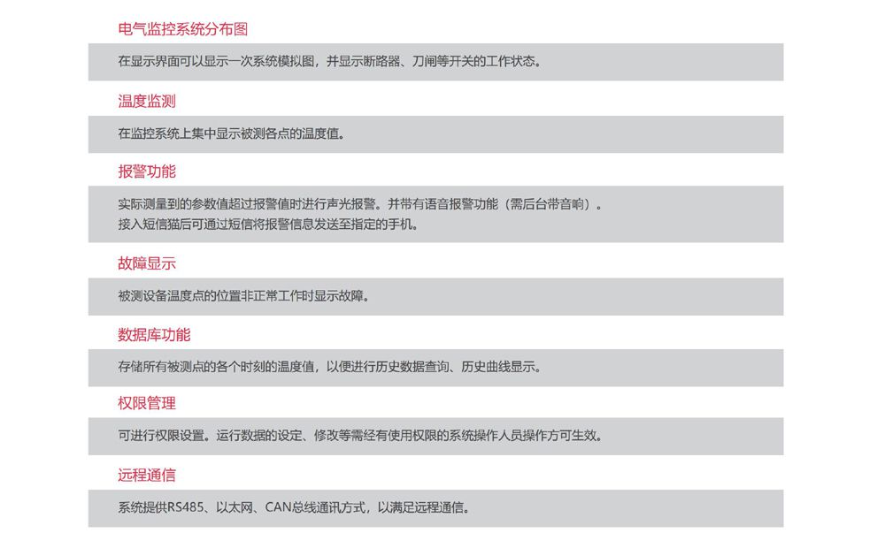 测温监控系统是对各个被测温设备的数据采集操作主要包括主监控中心界面、参数设置、温度数据查询、告警以及温度值实 时曲线和历史曲线,使管理者进一步了解设备运行时的温度状态,为设备检修及维护提供参考。
