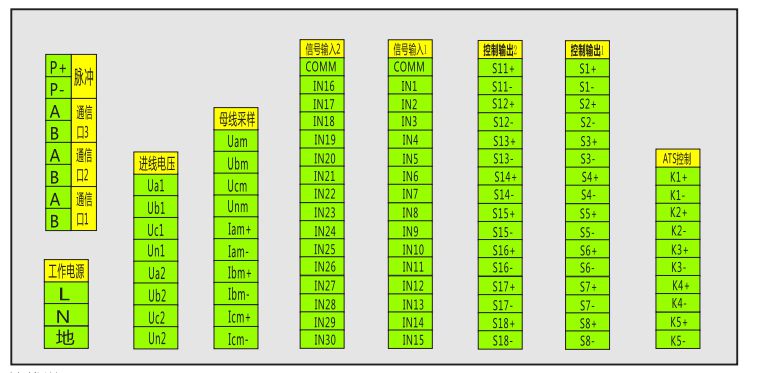 2、Ual~Ucl为1路进线电压采样端子,Ua2~Uc2为2路进线电压采样端子;
