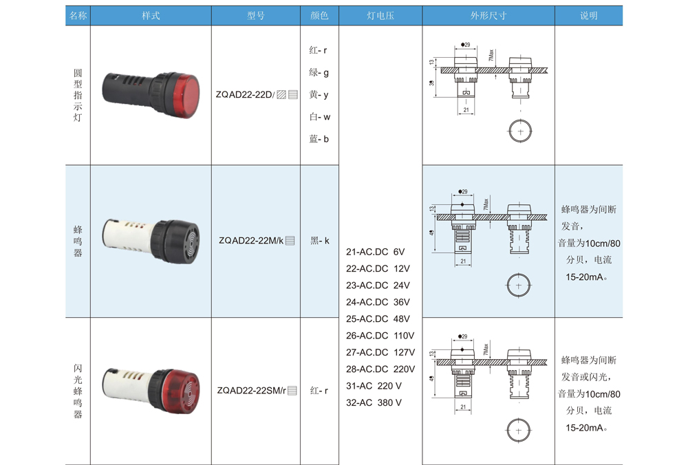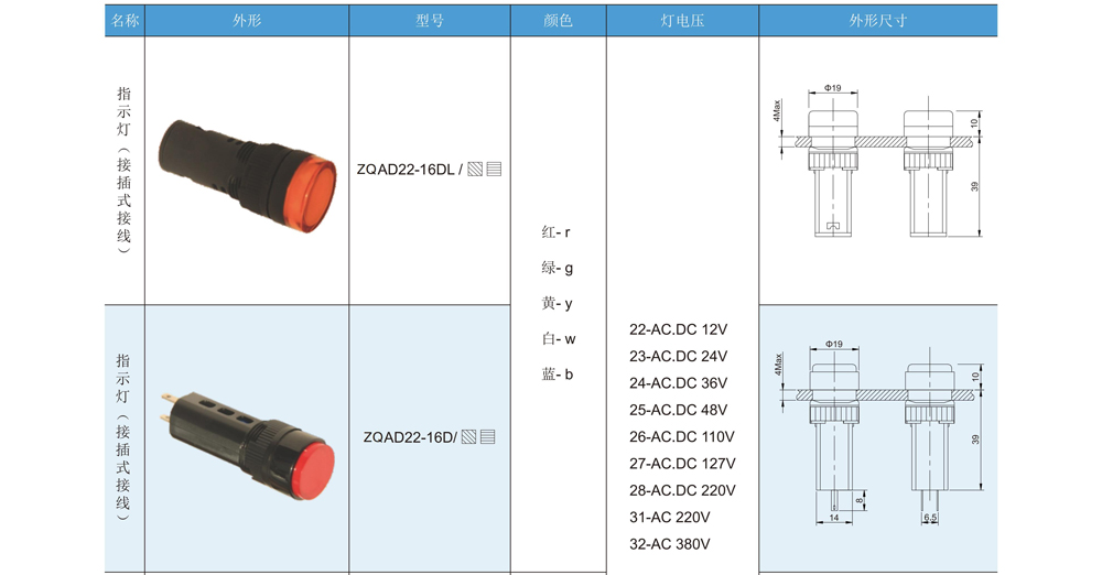 ZQAD22系列指示灯均采用高亮纯色LED发光芯片为光源,寿命长、耗能低、体积小、重量轻,是XD型各类白炽灯和氖灯指示灯的更新换代产品。我厂相继推出的AD22-22型、AD22-16型指示灯以高亮度高,可靠性好,造型美观和制作精巧为特点,普遍得到广大用户的好评,为满足用户日益提高的品质和审美要求,我们又开发出AD22-22双色灯、位置指示器、闪光蜂鸣器及超短型指示灯,并采用了与LA31系列按钮风格相一致的外观设计,灯罩内可刻印各种国际标准符号或定制符号,灯罩采用高强度聚碳酸酯制成,具有良好的抗冲击性能,内置螺钉式接线,更安全、方便,所有的改进都将使您的选用更方便,设计更完美。